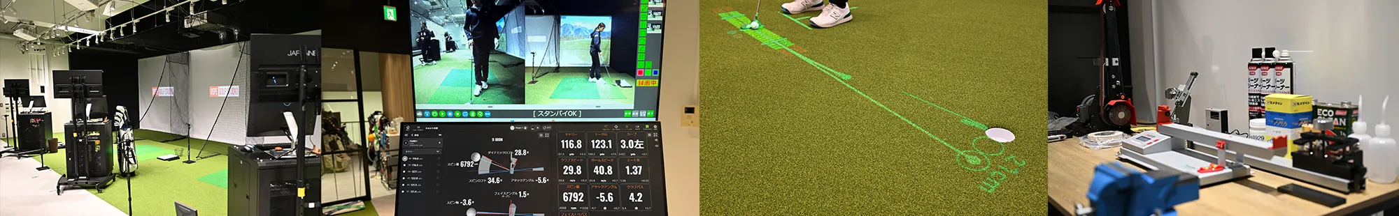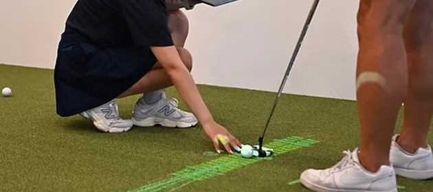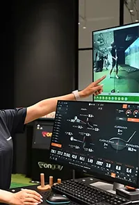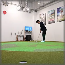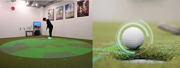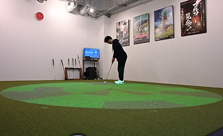 都内でも希少なARパッティングマシン。床に投影されたガイドラインの上をなぞることで、理想的な軌道を体感。スコアの40%を占めるパッティングを、感覚任せから「安定したパッティングスキル」へと変えます。